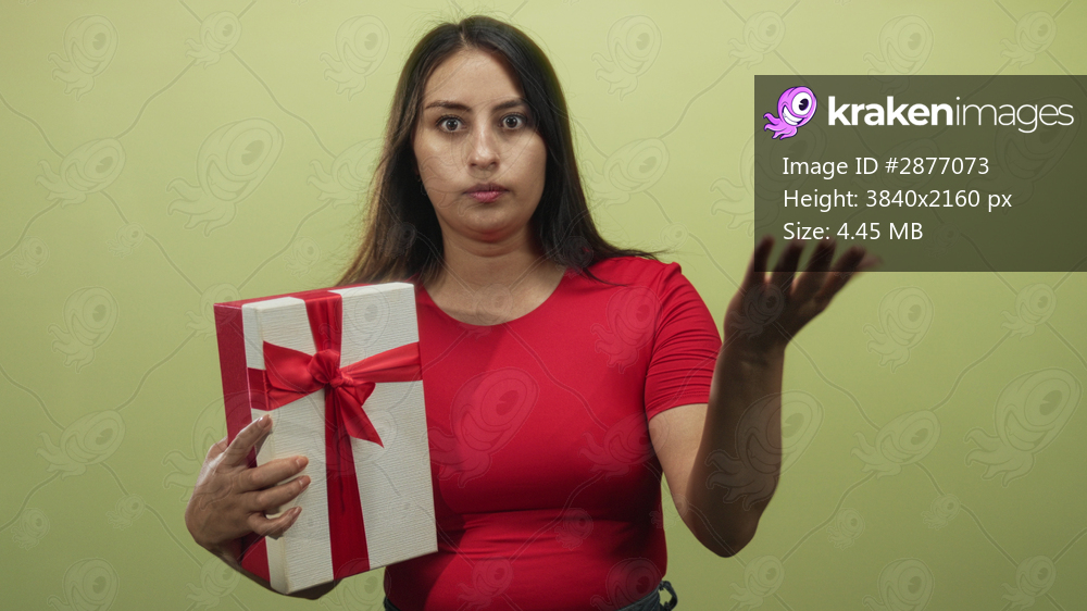 Young hispanic woman holding large white gift box with red ribbon and extended hand in green studio; surprise offering.