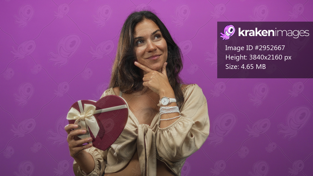 Young hispanic woman holding maroon heart gift box with cream bow and hand on chin in purple studio; thoughtful curiosity.