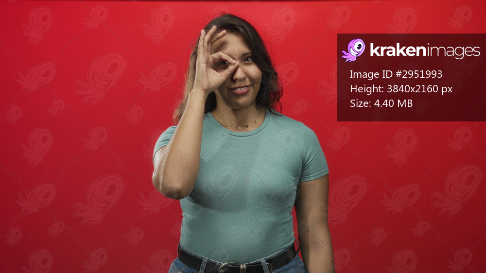 Young hispanic woman holding ok sign over eye and smiling in red studio wearing teal t shirt and jeans with belt visible; playful curiosity.