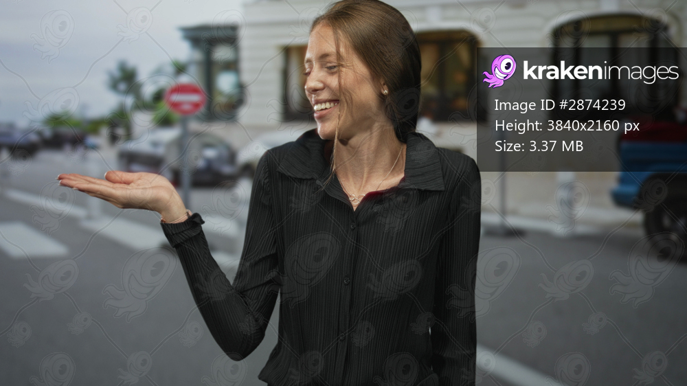 Young hispanic woman holding open palm up on city street crosswalk, smiling and looking at hand; cheerful confidence.