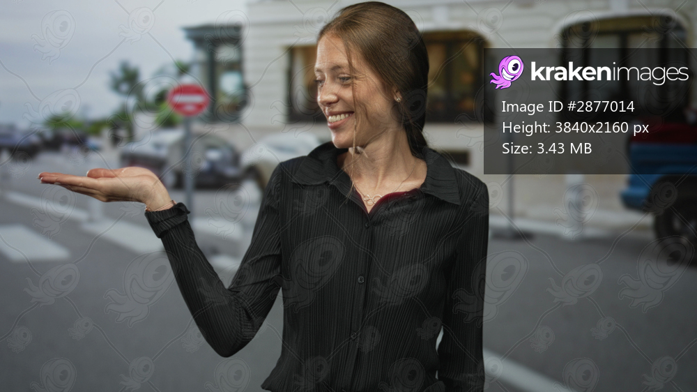 Young hispanic woman holding open palm up on city street crosswalk, smiling and looking at hand; cheerful confidence.