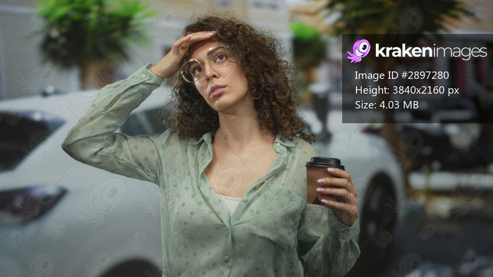 Young hispanic woman holding paper coffee cup and touching forehead on busy city street with parked car and potted trees; fatigue heat.