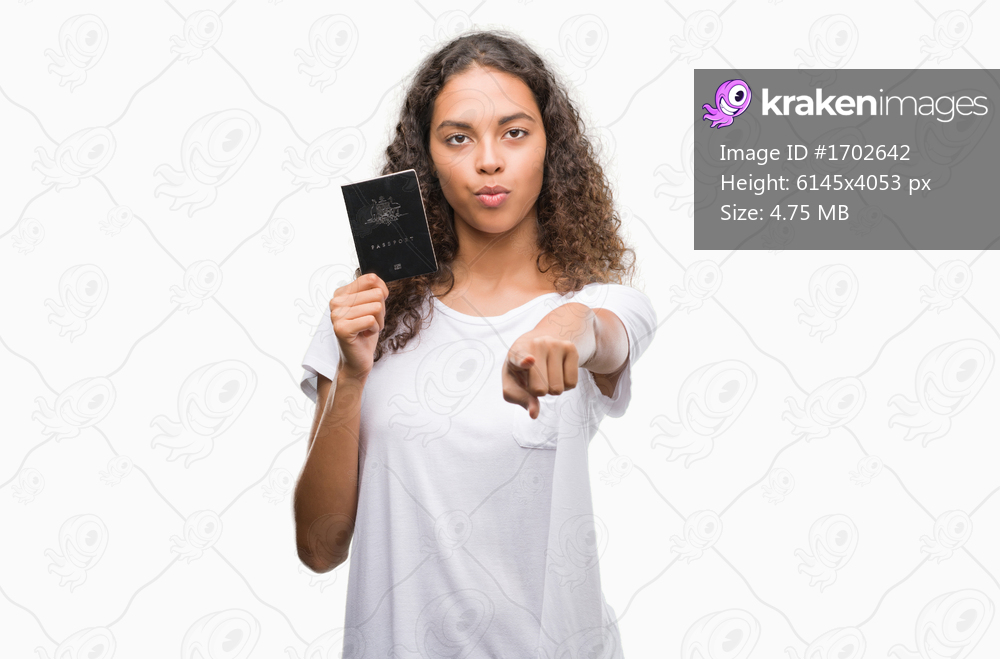 Young hispanic woman holding passport of Australia pointing with finger to the camera and to you, hand sign, positive and confident gesture from the front - Kraken Images