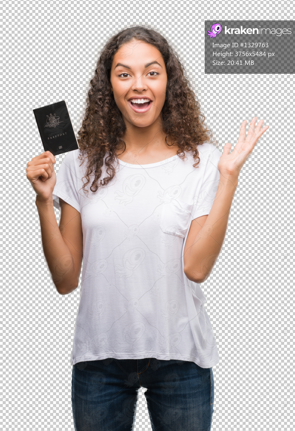 Young hispanic woman holding passport of Australia very happy and excited, winner expression celebrating victory screaming with big smile and raised hands - Kraken Images