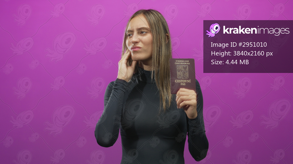 Young hispanic woman holding passport and pressing cheek with hand for toothache while squinting in studio; travel concern discomfort.