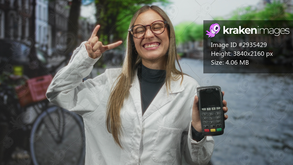 Young hispanic woman holding payment terminal and making rock horns gesture on canal street; playful.