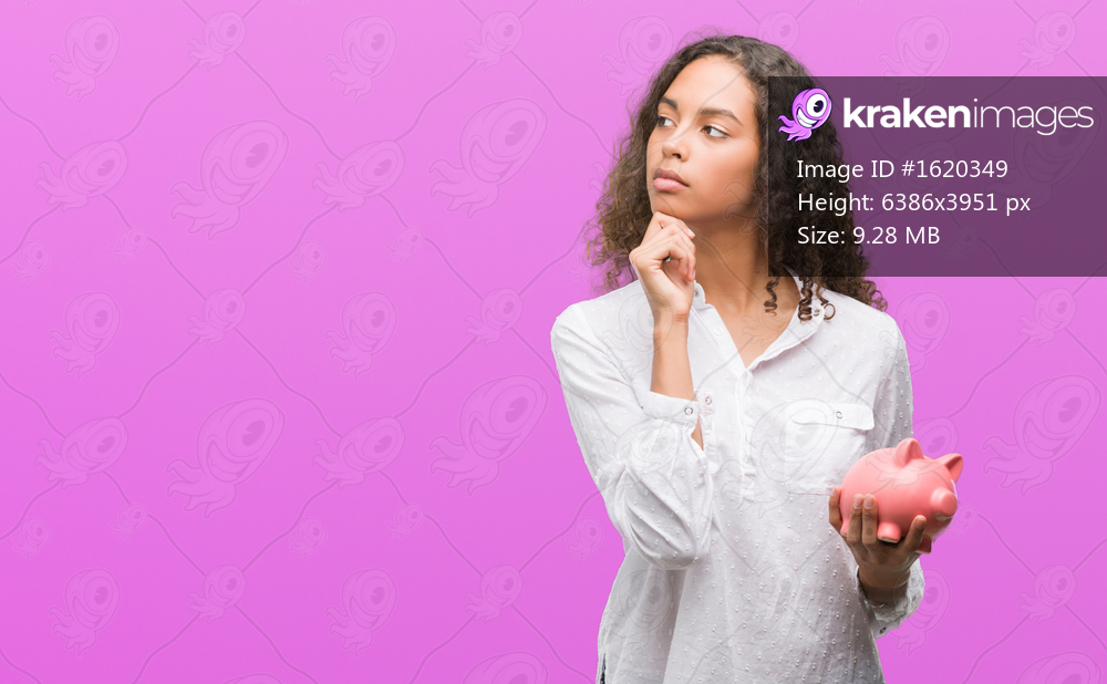 Young hispanic woman holding piggy bank serious face thinking about question, very confused idea