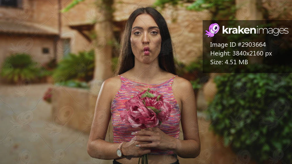 Young hispanic woman holding pink bouquet with both hands pursing lips on sunlit street in old town; playful romance.