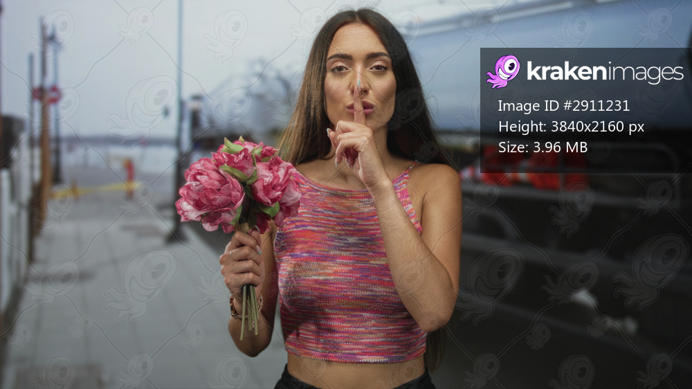 Young hispanic woman holding pink bouquet finger to lips for silence on street by waterfront pier; silence secret promise longing.