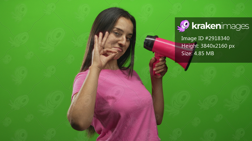 Young hispanic woman holding pink megaphone speaking into it in green studio; confidence empowerment announcement.