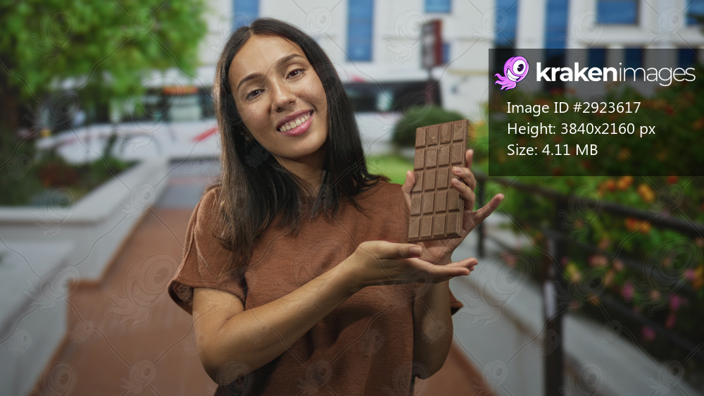 Young hispanic woman holding and pointing at a chocolate bar on street near building; sweet treat joy.