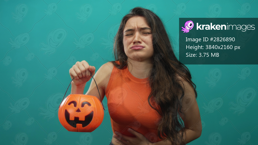 Young hispanic woman holding pumpkin bucket and clutching stomach in studio with teal background; discomfort.