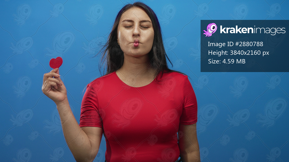 Young hispanic woman holding red felt heart near her lips and puckering them in studio; playful affection valentine.