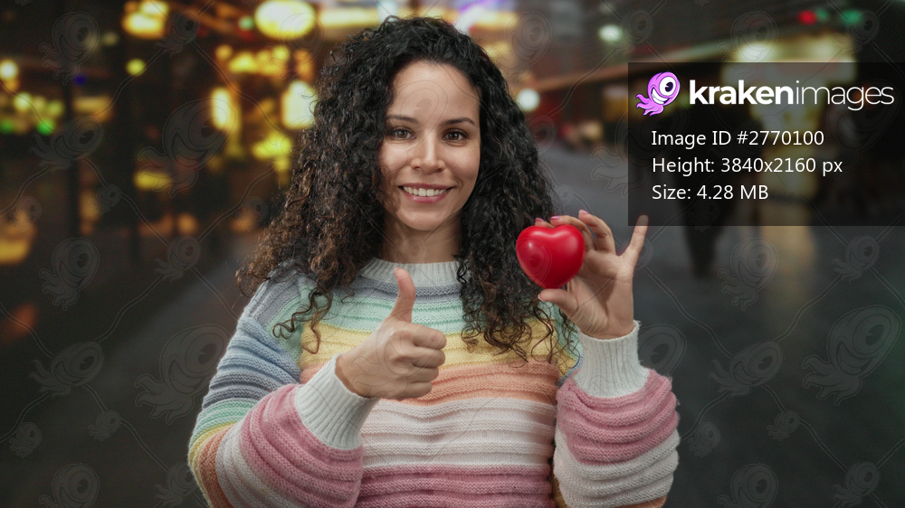 Young hispanic woman holding red heart-shaped object and gesturing thumbs up in brightly lit street with blurred background under night lighting.