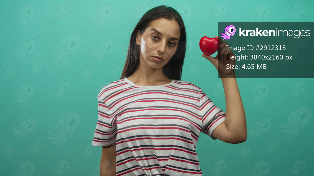 Young hispanic woman holding red heart up near face with right hand in teal studio; contemplation longing introspection.
