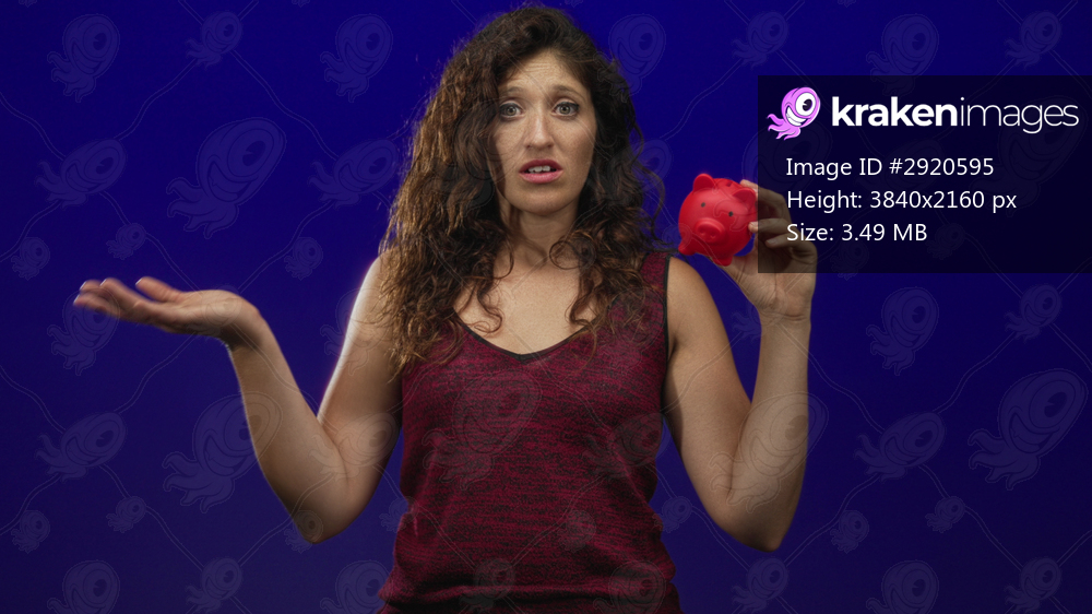 Young hispanic woman holding red piggy bank, palms up in a shrug gesture in studio; financial worry.
