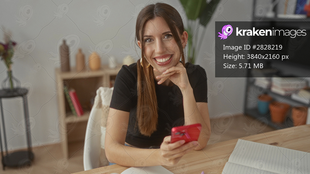 Young hispanic woman holding red smartphone and resting hand on chin in building interior; contemplation reflection introspection mindfulness.