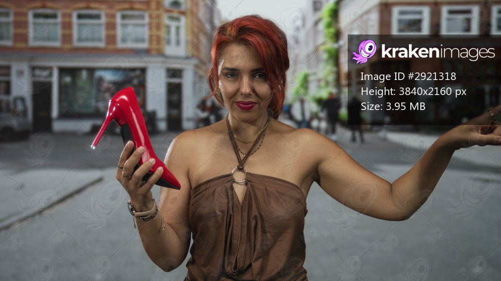 Young hispanic woman holding red stiletto shoe and pointing finger while standing among storefronts on a city street; curiosity shopping.