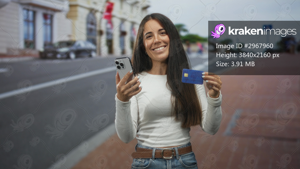 Young hispanic woman holding smartphone and creditcard, smiling and showing hands on a city street by sidewalk and parked car; confidence convenience.