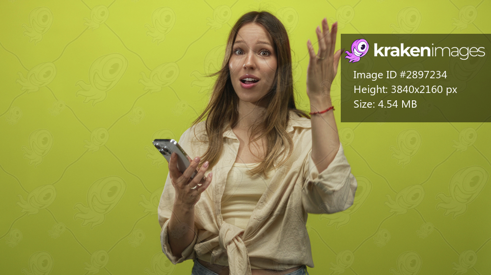 Young hispanic woman holding smartphone and gesturing with raised hand while speaking, posed in studio with lime green background; surprise curiosity.