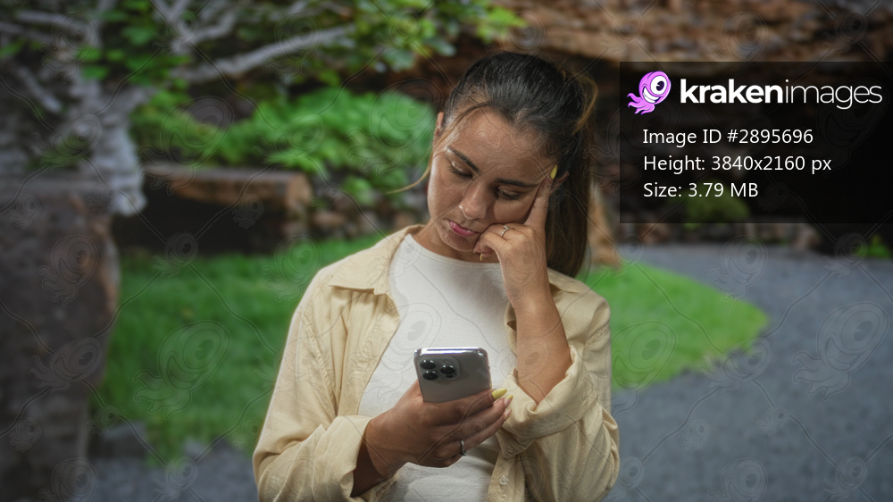 Young hispanic woman holding smartphone with hand on cheek in forest path near green park rocks; pensive.