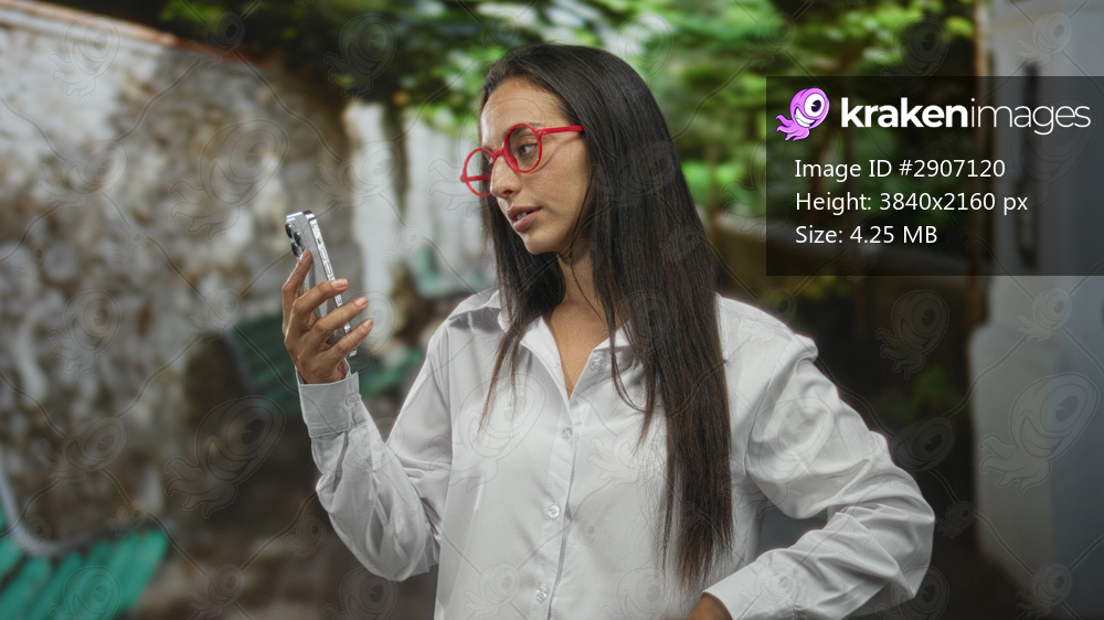 Young hispanic woman holding smartphone with hand to forehead signaling headache on street beside stone wall and bench; stress.