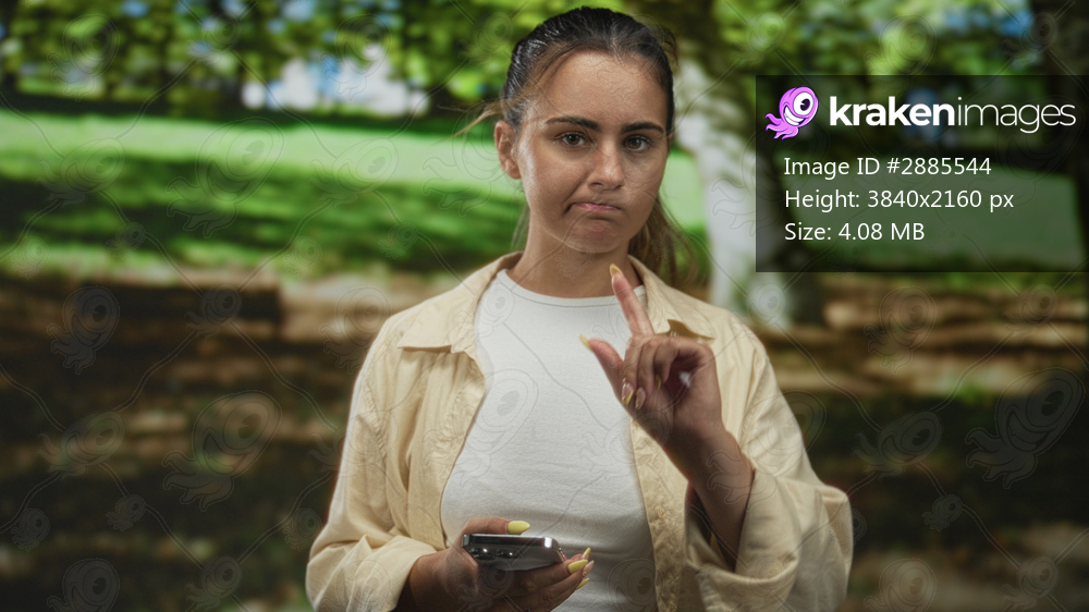 Young hispanic woman holding smartphone with hands visible, looking down while scrolling in park with trees and grass; quiet contemplation.