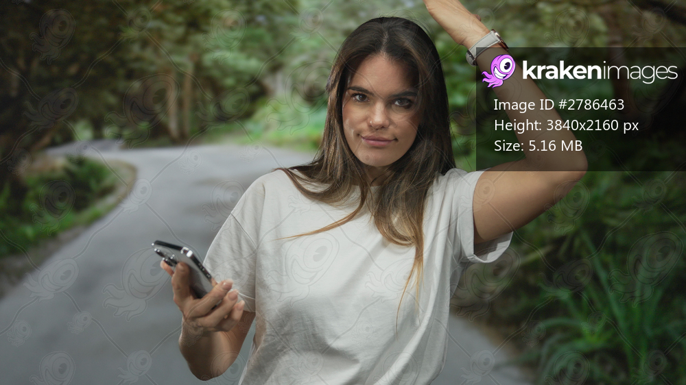 Young hispanic woman holding smartphone in outdoor park setting looks surprised with green trees around her