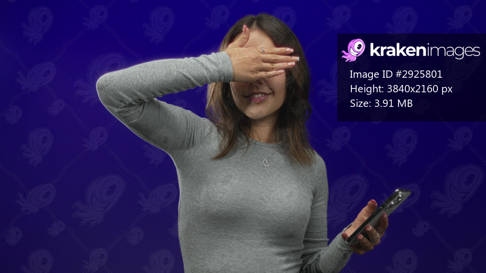 Young hispanic woman holding smartphone and raising hand to forehead in studio with deep blue backdrop; curiosity.
