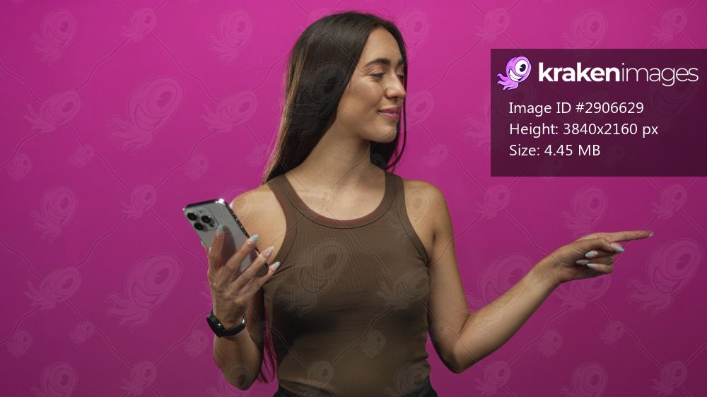 Young hispanic woman holding smartphone and smiling while pointing finger to the right in vibrant magenta studio; confidence connectivity.