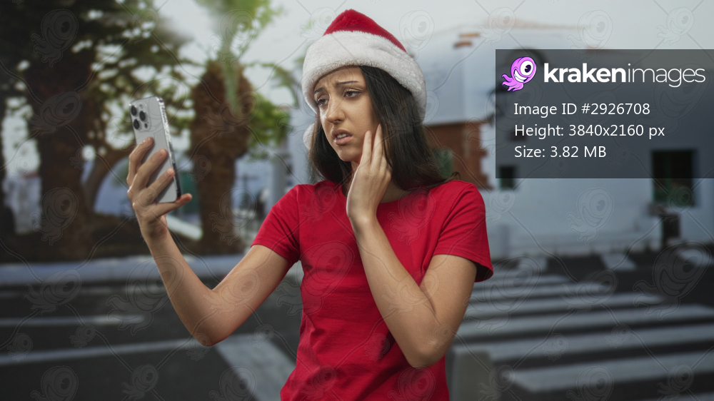 Young hispanic woman holding smartphone and tapping its screen while frowning on a city street crosswalk wearing a santa hat; holiday frustration.