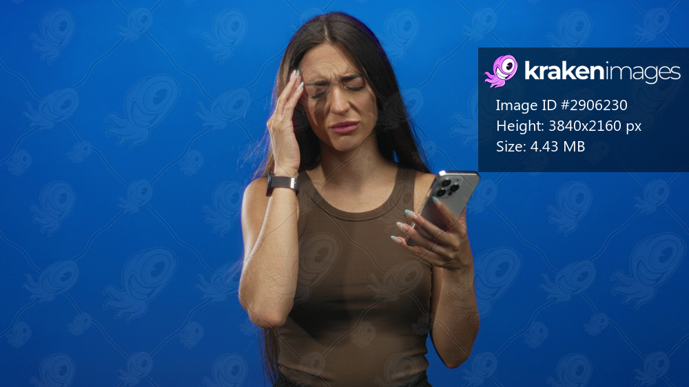 Young hispanic woman holding smartphone and tapping screen with hands in blue studio wearing brown tanktop and smartwatch; digital frustration.