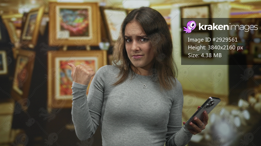 Young hispanic woman holding smartphone, thumb pointing back toward framed paintings on display in an art gallery building; mild skepticism.