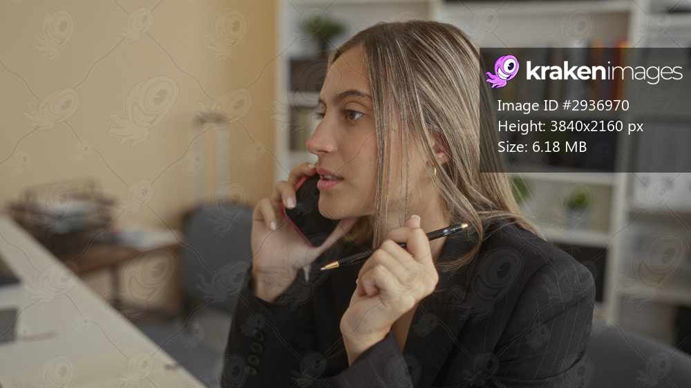 Young hispanic woman holding smartphone to ear with pen poised near mouth while seated at office desk with bookshelves and files visible; concentration planning. - Kraken Images