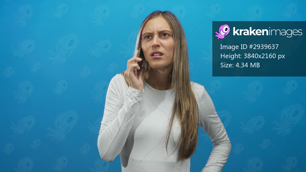 Young hispanic woman holding smartphone to her ear while tilting her head and looking upward in a blue studio; frustration.