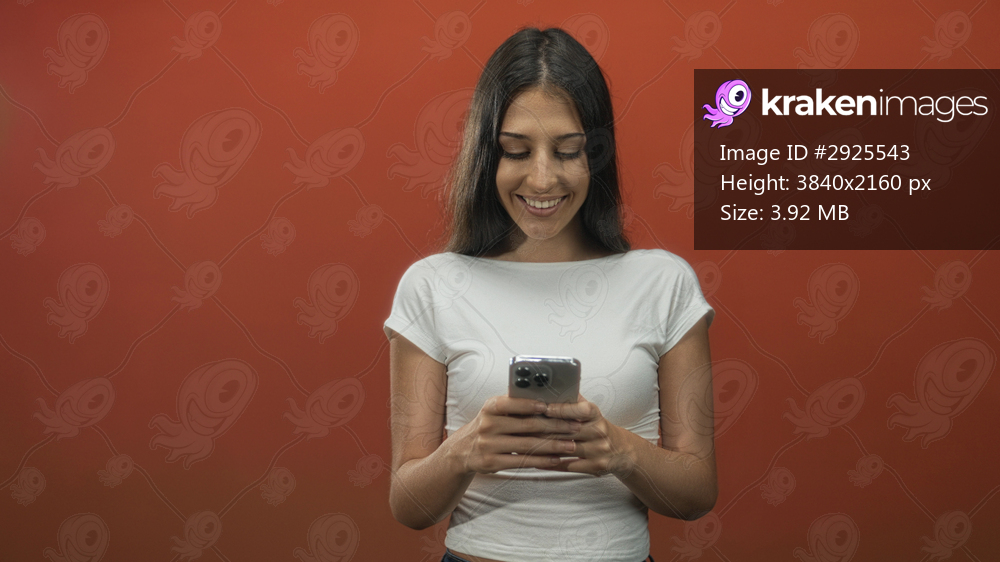 Young hispanic woman holding smartphone and typing with both hands in studio against an orange wall while smiling softly; contentment connection.