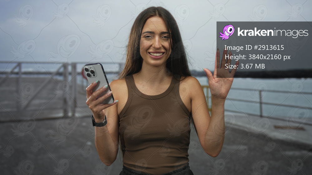 Young hispanic woman holding smartphone and waving hand on a seaside street promenade near a metal railing and pier; cheerful greeting.