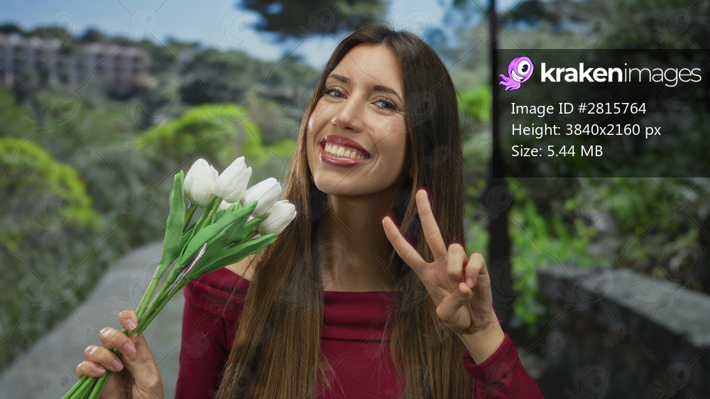 Young hispanic woman holding and smelling white tulip bouquet in lush forest under soft sunlight; serenity.
