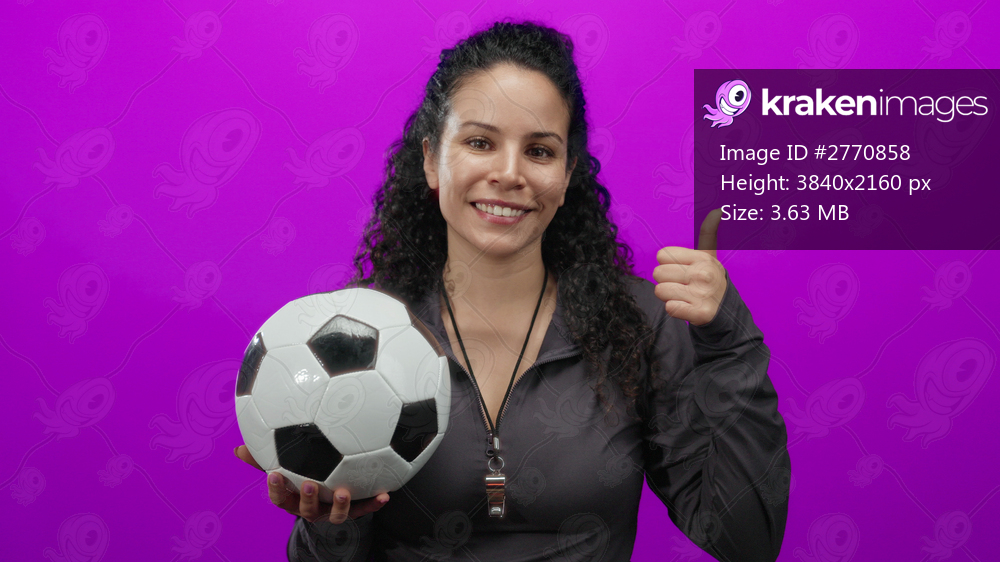 Young hispanic woman holding soccer ball and giving thumbs-up with a whistle around her neck against a vibrant pink background