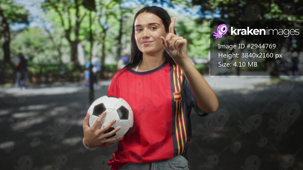 Young hispanic woman holding soccer ball with her hand while pointing index finger upward on a city street park path, wearing red spain team jersey; team pride. - Kraken Images