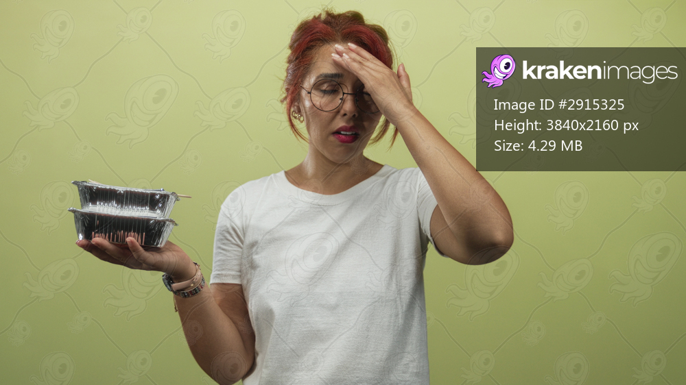 Young hispanic woman holding stacked foil food containers with hand on forehead in green studio; fatigue headache.