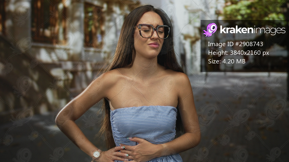 Young hispanic woman holding stomach with both hands on a street in strapless blue striped dress and glasses, pained grimace; discomfort.