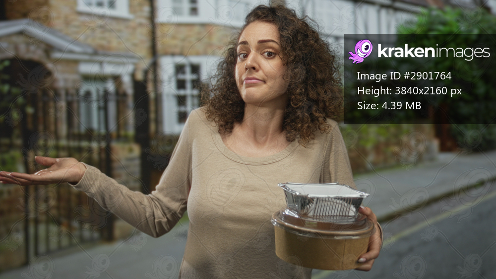 Young hispanic woman holding takeaway food containers with hand palm up shrugging gesture on street outside house gate; indifference waiting.