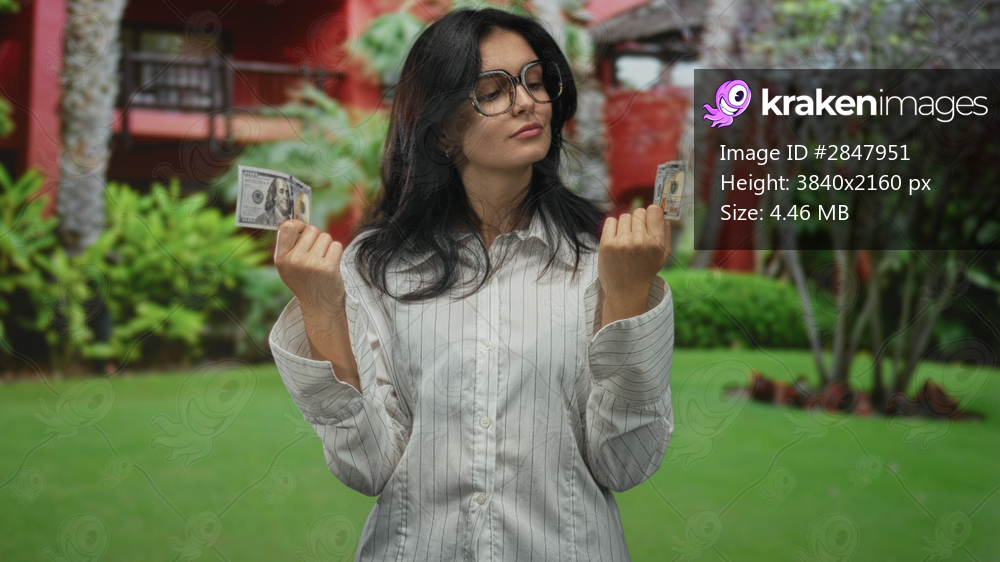 Young hispanic woman holding two hundred dollar bills and smiling in front of red building; prosperity.