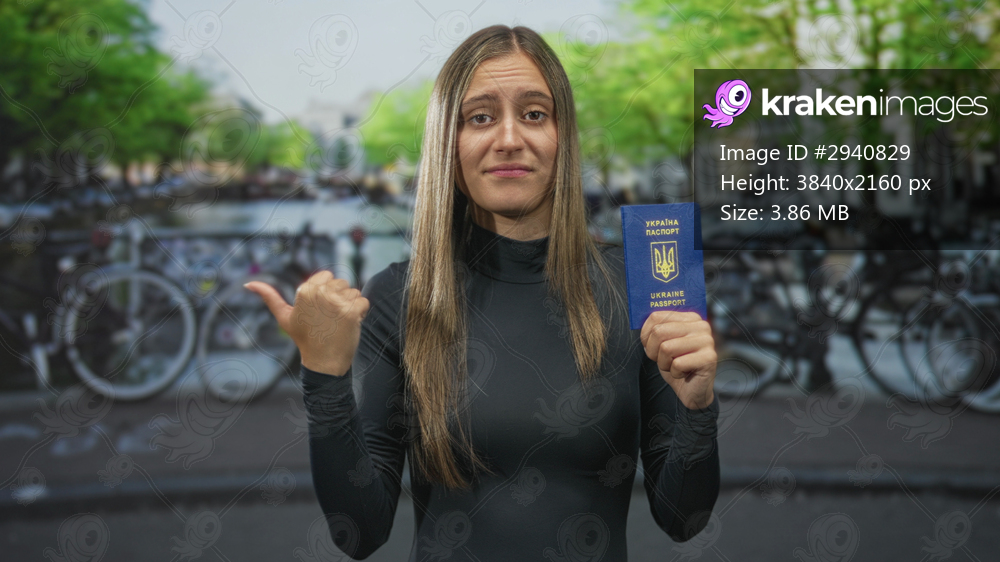 Young hispanic woman holding ukraine passport and pointing thumb to side while standing on a city street by canal with bicycles and bridge; pride.