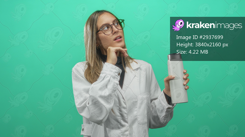 Young hispanic woman holding white travel bottle and resting chin on hand in studio with green backdrop and eyeglasses visible; thoughtful.