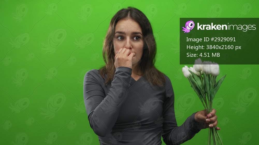 Young hispanic woman holding white tulips bites nails and looks sideways in a green studio; nervousness hesitation.