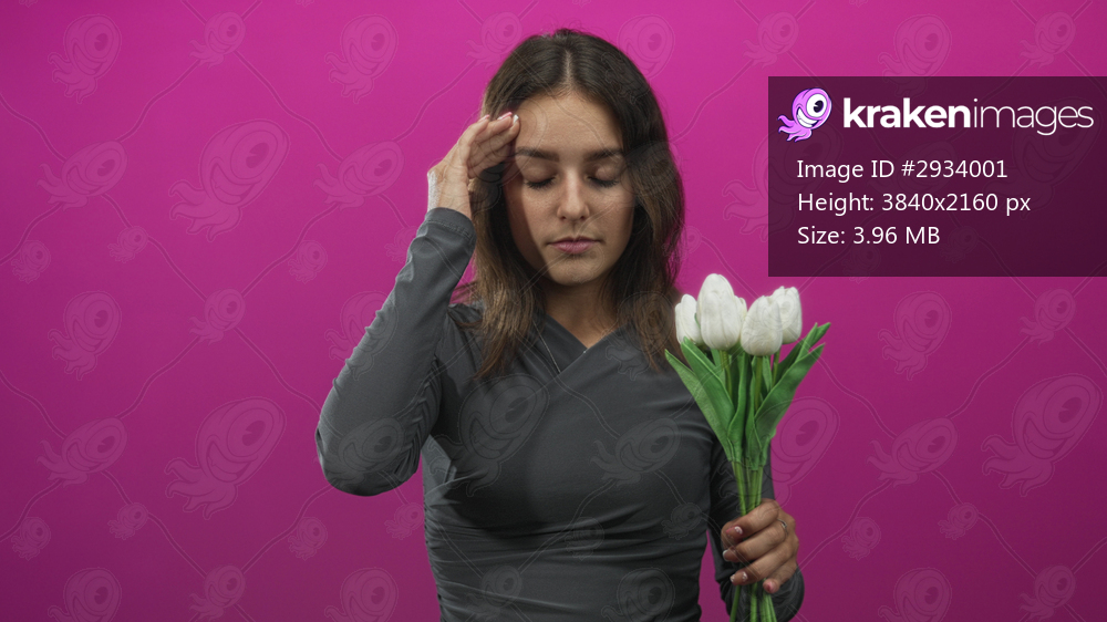 Young hispanic woman holding white tulips, eyes closed and pressing temple with hand in magenta studio; fatigue headache introspection.