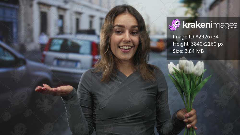 Young hispanic woman holding white tulips on a cobblestone city street, palm up presenting gesture while looking at flowers; gift moment delight.