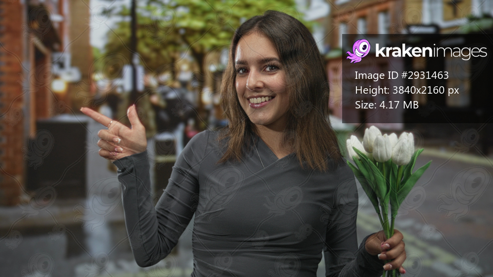 Young hispanic woman holding white tulips points finger on a damp cobblestone city street while smiling and looking at camera; playful joy.